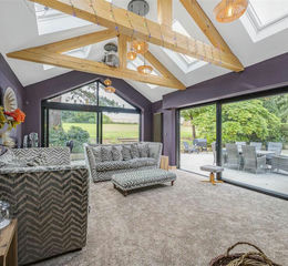 The living room is a good size room with a vaulted ceiling with high level windows, a TV point, bi-folding doors to the rear garden. The dining area has bi-folding doors to the rear garden and is open to the kitchen with fitted wall and base units comprising a sink and drainer unit with mixer taps, a built in dishwasher, integrated fridge freezer, a built in double electric oven, 5 ring gas hob with filtered hood over and tiled splashbacks.