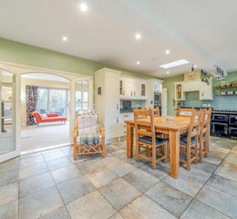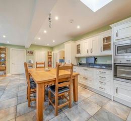 The generous kitchen provides a highly practical and sociable space that comfortably accommodates both cooking and dining. A comprehensive range of units is complemented by extensive work surfaces and integrated appliances, while the layout offers direct access to the utility room and an easy connection through to the living accommodation, reinforcing the kitchen’s role as the main hub of the home.