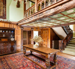 The solid front door opens into an 18ft. 9 by 16 ft. 10 hall which is lined with early 17th century oak panelling and has a part double height ceiling with exposed beams. The ceiling below the landing is panelled and embellished with rosettes and fleur-de-lys. A door in one corner leads to a staircase giving access to the boiler room and the extensive cellars. The boiler room houses two Ideal boilers and two Megaflow tanks. The boot room has space for coat and shoe storage and leads to a cloakroom which has a quarry tiled floor and is in two sections. The first section has a pedestal washbasin, a door to the rear garden, and a door to the second room which has the WC.