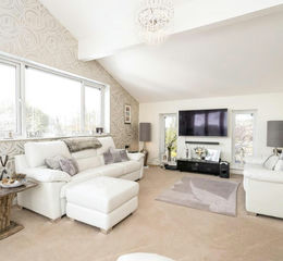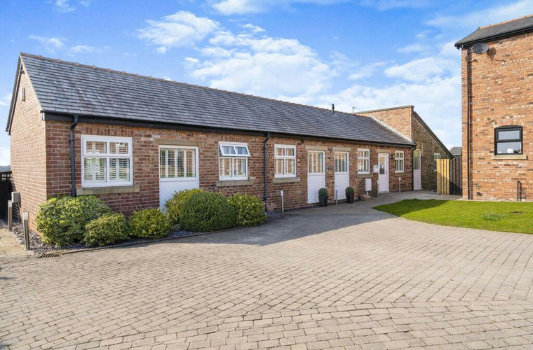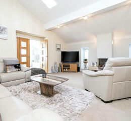 The exclusive development is accessed via electronically operated gates linked to an intercom entry system. Stunning throughout, briefly comprising of entrance hall, three reception rooms, two with vaulted ceilings and bi-folding doors, striking fitted kitchen with island, utility room, family bathroom, master bedroom boasting en-suite and two further double bedrooms. A block paved courtyard offers parking for several vehicles leading to detached double garage with electric door. Enclosed gardens to the side and rear offering well maintained outdoor space with panoramic views and a timber built outbuilding offers a variety of uses, currently being utilised by the owners as an exterior bar.