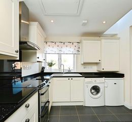 Wall and base units with granite worktops, sink and mixer tap, space for cooker, space and plumbing for washing machine, space for undercounter fridge, double glazed window to front, underfloor heating