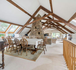 With vaulted ceilings and exposed beams, the naturally light first floor offers a spacious but cosy open-plan sitting/dining room divided by an exposed stone fireplace. The kitchen provides plenty of mounted storage units, a breakfast bar and space for appliances. There is a further double bedroom with vaulted ceilings, views over the surrounding countryside and an ensuite.
