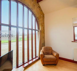 Living Room - 6.48m x 3.84m (21'3" x 12'7") - Featuring hardwood sealed unit double glazed floor-to-ceiling arched window with stunning views to the front aspect. Further hardwood sealed double glazed window to the side, stone fireplace with convector stove-effect electric fire, exposed beams to the ceiling, laminate flooring, two double radiators, wooden door to the side elevation.
