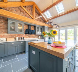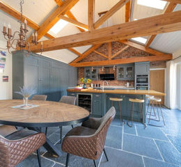- Large, open-plan dining kitchen with vaulted beamed ceiling