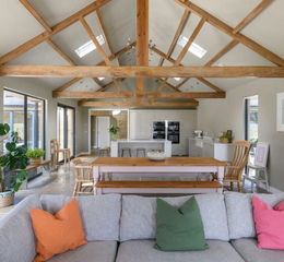 Finished to a high standard throughout, the interior combines natural stone and timber to create a grounded, organic feel. Deep-set windows and vaulted ceilings enhance the sense of light and space, while underfloor heating runs throughout the property. A full-height glazed entrance introduces a tactile material palette that continues inside through stone flooring, exposed beams and muted, earthy tones. The expansive kitchen, dining and family room is the central space, arranged around a bespoke Neptune kitchen with Corian worktops and integrated appliances. A large island provides a natural anchor to the space, which flows through clearly defined dining and seating areas. An array of windows frames far-reaching countryside views and brings in natural light throughout the day, while sliding doors open directly onto the south-facing courtyard.