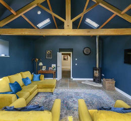 Beyond the kitchen, a more intimate sitting room with a vaulted ceiling and wood-burning stove offers a relaxed, quieter space, with bi-fold doors opening directly to the outside and offering a wide-angle connection to the surrounding landscape. A study sits nearby, along with a boot room and utility room providing practical support to the main living areas. There is also a guest WC off the hallway.