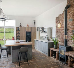 A broad open-plan lounge, dining and kitchen area forms the central space, its scale and design lending itself equally to relaxed family life or large gatherings. A full-height window frames the garden and countryside beyond, while exposed sandstone and a wood-burning stove give warmth and character. The kitchen was fully renovated in 2024, with sleek cabinetry, integrated appliances and a quartz and marble-topped island at its centre. An adjoining utility room provides additional storage and includes a bottled gas hob for flexible cooking.