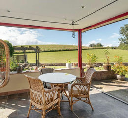 A glazed door opens through to a large garden room, a flexible space currently arranged as a gym and seating area. Full height bifold doors extend the room onto the terrace, drawing the garden in and opening wide views across the countryside, creating a natural link between indoors and out. Elsewhere on the ground floor, a modern shower room with steam shower and adjoining sauna offers spa style relaxation, while a collection of flexible rooms provides scope for varied use, including a snug, home office and guest bedrooms or the option for single storey living.