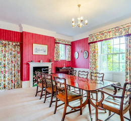 The impressive dining room is a formal space with a charming fireplace and beautiful views over the grounds. It is an exceptional setting for a special occasion.