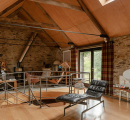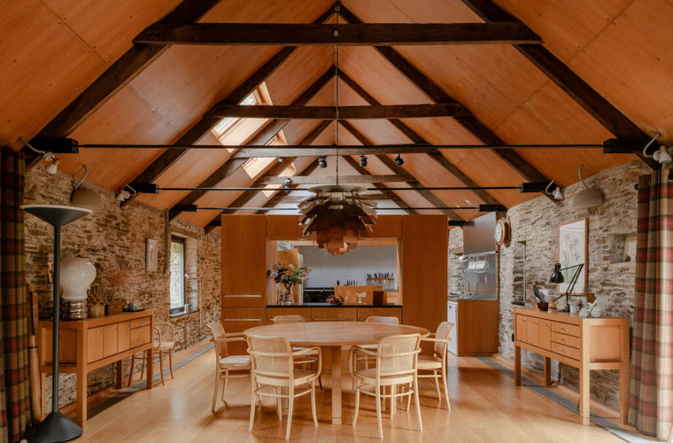 Spanning over 3,000 sq ft, this remarkable four-bedroom house in Devon was reimagined by its former owner, Sir Kenneth Grange - one of 20th-century Britain’s best-known industrial designers. Its upside-down configuration carves out a series of spectacular, interconnected living spaces upstairs, united by exposed stone walls, oak joinery and a dramatic pitched roof. Grounds of around 37 acres emanate from the house and are a mix of gardens, pasture and woodland; there are also a series of characterful agrarian outbuildings that include Grange's former workshop/studio.