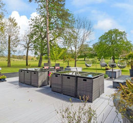 The dining space can accommodate a table for twenty, making dinner parties an impressive affair. Open the bifolds on a warm evening to enjoy pre-dinner drinks before dinner around the spectacular table. At the other end of this room is the TV and chill-out zone, with huge squishy l-shaped sofas providing the perfect spot to relax in front of a movie with the gardens and grounds providing an idyllic backdrop.