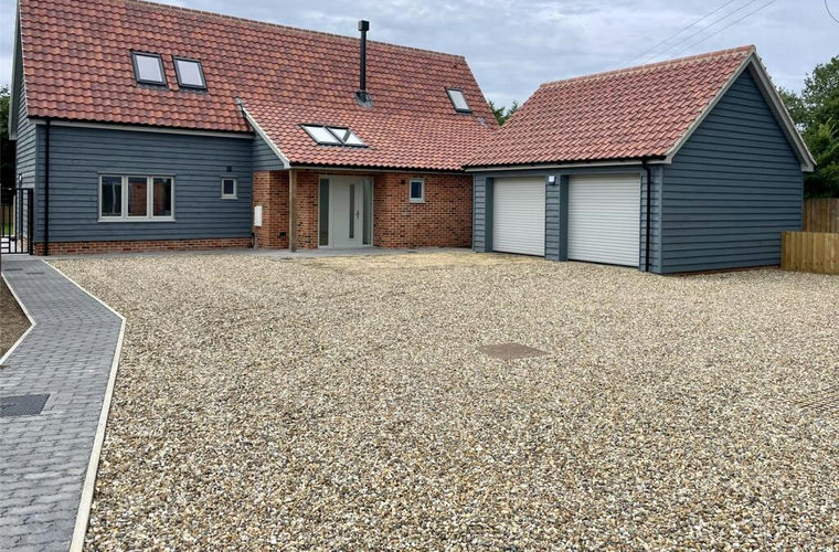 Constructed by a long established and respected local builder these individual properties are a rare opportunity to acquire small scale quality homes in a time of mass produced hurriedly built units. Time has been taken to complete each of the three different properties and this is clear from the quality of brickwork and internal finishes. Plot 2 has a remarkable story to tell and at first glance suggests it is a brand new property designed to appear as a timber frame barn type building. Whilst this is true to a point, it is not until stepping inside one sees the true character of what is in fact the reconstruction of an actual timber frame threshing barn with all the timber features one would expect. This particular building has Suffolk roots and was constructed originally in Walsham le Willows. Having been dismantled by the current owner and carefully stored for over thirty years, it was not until Covid struck that time was found to explore the possibility of re erecting the barn. Moved to Hoxne, the timber frame was painstakingly re erected and as one will see when visiting, the interior offers everything one would hope for in a classic timber barn conversion. This really is the best of both worlds having as it does all the benefits of a new home along with the timbered character, space and volume of a barn. The cathedral like entrance, now featuring a bespoke Ash staircase leads you in to flexible multi room space which includes ground and first floor bedroom options including four bath/shower rooms and light, airy and voluminous day space. Underfloor heating extends through the ground floor with radiators upstairs all powered from a tailor made Samsung air source heat pump. Thoughtful installation of sockets, switches and lighting adds to the day to day convenience. The design of the house has incorporated clever sight lines with glazed openings visible throughout the interior. The well appointed kitchen includes AEG appliances including induction hob with integrated down draught extraction, full size dishwasher and 72L & 40L ovens including microwave function. Likewise, bath and shower rooms include stylish fittings, washstand storage and touch sensor mirrors. Outside, similar attention to detail and time now shows us grass seeded lawn within close boarded fencing to the rear along with pathways and patios created from porcelain tiled surfaces. A detached double garage with additional parking space sits to one side.
