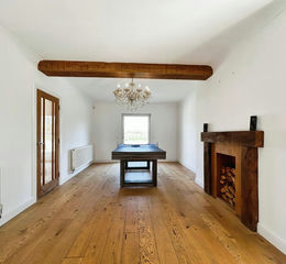 Via double composite doors into the entrance hall/dining room/games room. PVCu double glazed full height door leading out to the rear garden and finished with emulsioned and coved ceiling with exposed mock beam, central chandelier, emulsioned walls, skirting and solid oak floor. Feature mock fireplace with oak mantel. Door through to hallway and arch through to separate hallway.