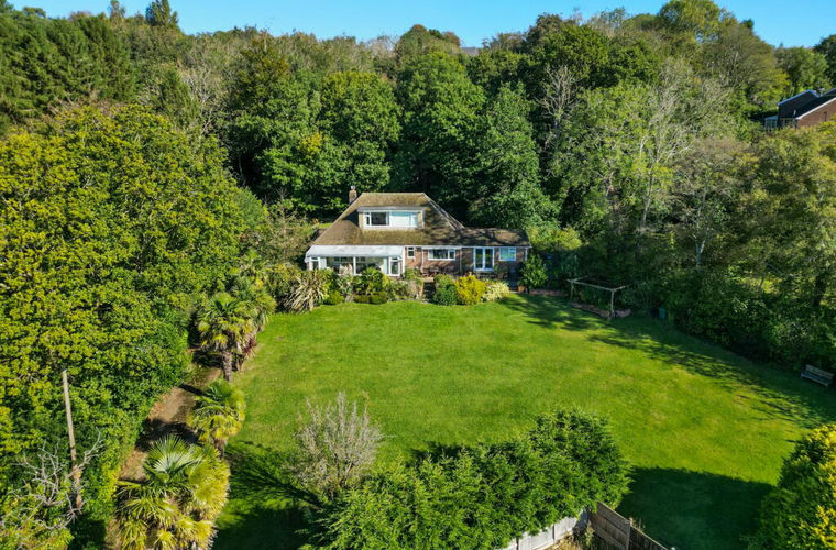 Situated in a fabulous setting up a long driveway within a popular part of town, this large detached chalet style bungalow is surrounded by gardens and grounds that extend to approximately 2 acres (tbv) offering privacy and seclusion whilst commanding fabulous southerly views over the town towards the English Channel. Set up a long private driveway, the gardens are predominantly set to the front of the property with large areas of patio that take in the views and to the rear is a section of broad leaf woodland. The accommodation is spacious and has been extended since it was originally built and now provides generous reception rooms that take in the fabulous views with two principal reception rooms, a garden room, two ground floor bedrooms, one with an en-suite, and two first floor bedrooms. The property benefits from double glazing and gas central heating and whilst tucked away it is conveniently situated close to the town centre and seafront.