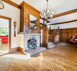 The superb accommodation is arranged over four floors and entered through a striking circular vestibule that opens into the main hall with an elegant open fireplace, sweeping staircase, wood panelling, herringbone flooring and stained glass windows. A panelled cloakroom WC and a sizable dry cellar is accessed from the hall.