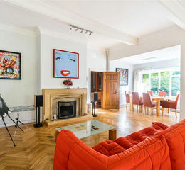 Upstairs, the first-floor landing doubles as a wood panelled study area with built-in shelving. The principal suite enjoys garden views from a curved bay with fitted wardrobes and a luxurious en-suite featuring a freestanding bath, walk-in shower and twin basins. A further three double bedrooms, one with en-suite facilities are served by an independent bathroom with separate WC. The second floor provides a spacious additional bedroom with Velux balcony windows, a through shower room and loft access.