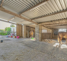 Victoria Dairy is approached via a wide courtyard offering secure parking and access to the outbuildings. A large barn, fully serviced with electricity, was previously configured with four stalls and could readily be reinstated for equestrian use. At present it provides a feed room and large open-plan space for horses, opening onto a dry turnout area and then out to the paddocks. The additional outbuildings offer storage or scope for further equestrian facilities.