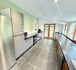 Kitchen - 6.38m x 2.97m (20'11" x 9'9") - Bespoke contemporary style kitchen units at base level, with painted oak work surfaces, 1.5 bowl sink unit with mixer tap, electric cooker points, space for dishwasher. Further contemporary styled fitted kitchen units, double aspect windows including double doors to Verandah, tiled flooring.