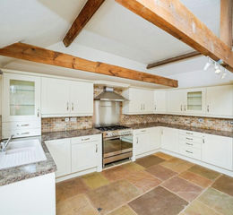 Brimming with character and contemporary practicality, this warm and welcoming kitchen/diner forms the heart of the home. Spacious & thoughtfully arranged, it showcases a generous array of wall and base units set beneath natural-look work-tops, complete with a classic sink and drainer. A double free-standing gas cooker adds a farmhouse flourish. Integrated appliances include a fridge/freezer and dishwasher for sleek functionality. Complemented by two wooden front-facing windows with stone windowsills, Yorkshire stone flooring, and exposed high beam ceilings, the space feels timeless, airy, and full of character.