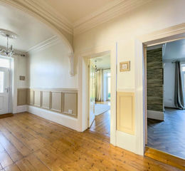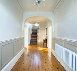 With modern panelling to half height. Stripped wood floor.
