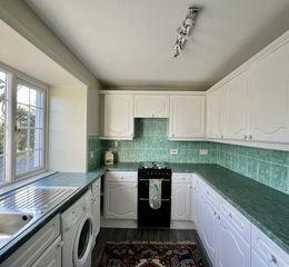 Galley style kitchen with a good range of fitted kitchen units and laminate work surfaces. Tiled splashbacks. Stainless steel sink with mixer tap and drainer to side. Washing machine. Freestanding electric oven with extractor hood above. Freestanding Haier freezer. Ceiling spotlights. Smoke alarm. uPVC double glazed window with outlook to front and deep sill. Radiator. Wood effect vinyl flooring.
