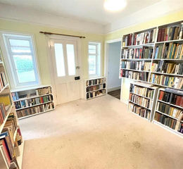 There is a long veranda with paned and glazed ends at the front of the property, perfect as a sitting space, or for garden storage. From here a half-glazed door leads into a large central entrance hall, with doorways radiating off to all rooms, and shelving on all walls. There are a ceiling hatch and a loft-ladder to the large open standing-height loft (potential for conversion), with floorboards and a roof light.