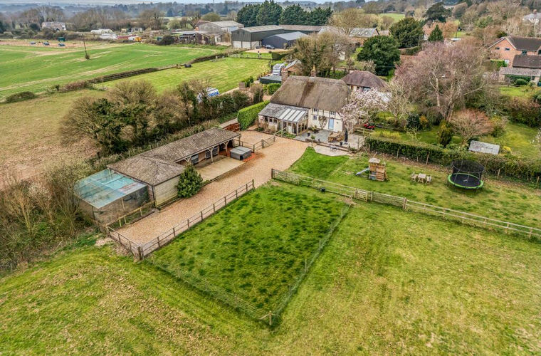 Fig Tree Cottage is a superbly presented and beautifully appointed charming 17th century Grade II listed detached cottage with equestrian facilities including 3 paddocks and 4 stables (one is used as Home office with power/wired for internet), set in tranquil gardens and grounds of approximately 5.8 acres. It is understood that the cottage has undergone extensive refurbishment over the years, retaining an abundance of original period features including two staircases, exposed timbers, exposed internal brick walls, flagstone floor in the hallway and an Inglenook fireplace. Upon entering the cottage there is welcoming reception hall with a door leading into the double aspect sitting room with an Inglenook fireplace. A door leads into the large triple aspect utility/playroom with a second staircase rising to first floor. From the main reception hall a doorway leads into the study area with a cloak room/wc and a door leads into the dining room. The inner hall leads down into the impressive triple aspect kitchen/family room, which features a vaulted beamed ceiling, and has a an excellent range of wall and base units with a central island breakfast bar and full range of built in appliances and extensive worktops and bi-fold doors leading out to the sun terrace with magnificent open countryside view. From the reception hall there is a staircase rising to the first floor landing, which leads to three double bedrooms, two large bathrooms, a nursery/dressing room and second landing/wardrobe area and second staircase leading down to the large utility room. There is direct access from the garden to the equestrian facilities, which also has an independent gated access. Located in a wonderful country setting within The South Downs National Park.