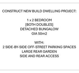 ASKING PRICE £140,000..... GDV £350,000, GROSS PROFIT £100,000, GROSS PROFIT MARGIN 28.6%, GROSS MONTHLY RENT £1,500, GROSS ANNUAL RENT £18,000, GROSS RENTAL YIELD 7.2%..... CONSTRUCT NEW BUILD DWELLING PROJECT..... CREATE 1 x 2 BEDROOM DETACHED BUNGALOW (GIA 50m2)..... SOLID FINANCIALS WITH LOW RISK