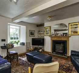 7.57m by 4.67m - Feature wooden double door entrance with window above, tiled floors, cast iron open fire with stone hearth wooden mantle, original wooden beams, under stairs wine cellar, windows to front with outstanding views of the gardens and surrounding areas. Opening to: