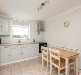 Having roll edge work surfaces with tiled splashbacks, sink and drainer with mixer tap, range of base level storage units, drawer units and matching eye level wall units, integrated electric oven and grill, four ring electric hob and illuminated stainless steel recirculation extractor above, window to rear elevation, coved cornice, ceiling light point, radiator.