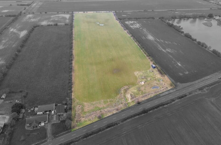 The land comprises a rectangular field with mature hedged boundaries currently set to grass.