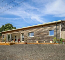 The property has a composite insulated steel sheet Tata Trisomet industrial/barn roof, oak clad walls and bespoke solid oak hand crafted front and back doors and oak framed porchway.