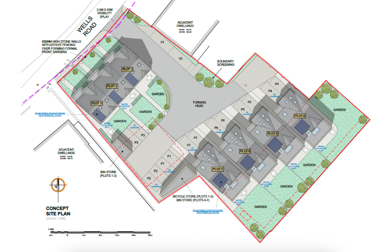 At the front and replicating the properties found either side of the site would be a terrace of three properties, Three 3-bed dwellings + loft room. Each would have a low walled front garden, a feature removed from many properties along the Wells Road and an enclosed rear garden with parking beyond. A short road to the east side of the terrace would give access to a further four, detached dwellings to the rear. All four properties would have a garage and appropriate parking with gardens to the front and rear. The access road would include a footpath for pedestrian use and a turning head for service vehicles such as rubbish collection and deliveries. Driveways to the rear properties and the parking area for the front terrace would all be accessed from the road. To the east side of the road would be a further two parking spaces for visitors. The houses would be built of local reconstituted stone and render under a profiled concrete tiled roof to compliment and reflect the traditional materials used in the neighbouring properties.