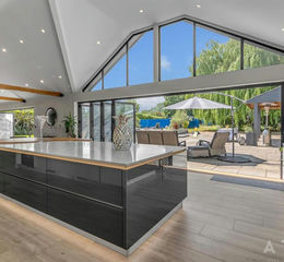 - Vast open-plan living area with vaulted ceilings, bifold doors, and integrated sound system