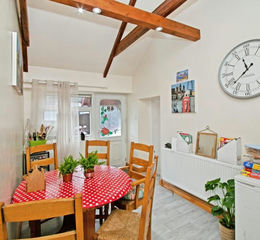 The well-presented accommodation comprises an inviting entrance hall, comfortable sitting room with open fireplace, dining room with striking vaulted ceiling, and a stylish kitchen fitted with contemporary grey shaker-style units. There is also a modern family bathroom with a white suite, and two attractive first-floor bedrooms.