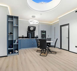 Beyond lies the heart of the home: a breathtaking open-plan kitchen, dining, and living space bathed in natural light from a full wall of tilt and turn French doors and a striking circular roof window. The seamless flow between inside and out makes this an exceptional space for both everyday living and entertaining. The contemporary kitchen is a masterpiece of design — with slimline work surfaces, bespoke cabinetry, integrated Bosch appliances, and feature LED lighting that subtly enhances the ambience from day to night.