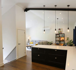 Vaulted space, engineered wood floor, electric under-floor heating, kitchen fitted with a range of matching base units and wall cabinets, integrated fridge, integrated freezer, integrated Bosch electric fan oven, integrated Bosch microwave fan oven, integrated Neff induction hob with extractor over, integrated Bosch wine cooler, built-in bin unit, white quartz worktop, double stainless steel sink unit with Quooker tap, integrated dishwasher, soft closing drawers, breakfast bar end with pendant lights over, large cupboard housing pressurised hot water system, extractor fan, spotlights.