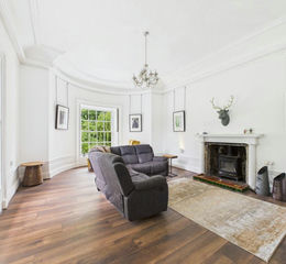 Spacious, elegant room with double aspect, with a beautiful side seating area with large curved window over looking the garden. Fireplace housing the wood burning stove.