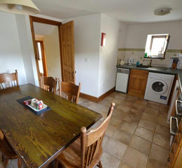 An L-shaped room fitted in a range of base and wall mounted units with work surfaces, single drainer sink unit with tiled splashbacks, electric hob with oven and extractor fan, space for fridge freezer, washing machine and slimline dishwasher, window to front, floor mounted oil fired boiler, space for table and chairs, radiator, tiled flooring.