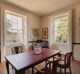 The main entrance leads through a classical portico into the reception hall, from which the principal rooms are reached. The formal sitting room is a beautifully proportioned space with a grand curved bay and tall sash windows overlooking the gardens. Deep skirtings, cornicing and a feature fireplace reinforce the building’s Georgian character, echoed across adjoining spaces including the dining room and breakfast kitchen. The kitchen is fitted with granite worktops and bespoke cabinetry, with a deep sash window above the sink and a practical utility room set just beyond. Two cloakrooms and a series of internal hallways serve the ground floor, linking domestic accommodation with a suite of offices, including three large rooms with tall ceilings and garden views, plus a separate office kitchen. The current configuration allows for light commercial or consultancy use while retaining full residential comfort, with scope for reconfiguration or reinstatement to full domestic use.