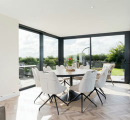 Living Room - 4.39m x 5.51m (14'5 x 18'1) - One wall almost entirely in glass with three panels, two of which open to the rear garden and enjoying views over the paddock to the rear. LED spotlighting. Vertical radiator. Attractive feature wall comprising vertical Yorkshire boarding.