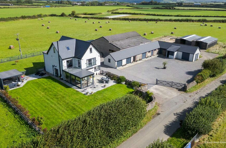 A wonderfully light individual house completed 3 years ago and recently extended on the site of a former farmhouse and is designed to take full advantage of the stunning all around views but particularly to the south over the Vale of Glamorgan towards the Somerset coastline beyond. Every single living room and bedroom enjoys wonderful views be it coastal or over the 9 acres or so of paddock/pasture which sweeps around the east, west and north. The accommodation is usefully flexible over three floors with huge "hub of the house" on the ground floor comprising beautifully fitted kitchen, dining area and living area with two walls almost entirely in glass, additional living room, cloakroom and utility room. From the large hall stairs lead up to the first floor with three bedrooms suites including splendid master suite with glass wall leading out to a large balcony with views to the south and west which just get even better. A staircase leads up to the second floor with three further rooms and a fourth bathroom.