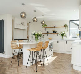 Kitchen/ Living/ Dining Room - dining/living room 11.56m x 6.02m x kitchen 4.29m - Very much the "hub of the house" and made wonderfully light via two walls substantially in glass with views over the grounds and countryside beyond. The kitchen area provides an extensive range of built in units finished in a country cream shaker style with contrasting black handles and white work surfaces. Features include a full length fridge, double fronted pantry style cupboard. Range master with two ovens and six ring gas hob, splashback behind with cooker hook over, fold out racked unit, sink unit with grooved drainer. Built under dishwasher with decor panel. Inset waste disposal system. Matching island unit with built under microwave, range of drawers and cupboards. Breakfast bar. Attractive lighting over island unit. Window overlooking front courtyard with views beyond. U style dining space with bi-fold doors leading out to front terrace and side garden enjoying wide ranging views. The living area enjoys attractive Westerly views and features a Contura log burning stove set into a traditional fireplace with slate hearth and timber mantle.