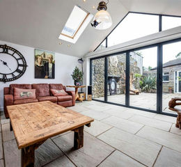 Summer Room - Indian sandstone flooring with under floor heating with wall mounted controls, Villager double fronted wood burning stove, bifold doors leading to Indian sandstone flagged private patio, triple glazed feature window, 6 Velux roof windows.