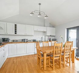 One of several converted farm buildings, this converted stables offers versatile living space for anyone looking to live on one level. With high ceilings and lots of natural light, this property has a well thought out layout, convenient for anyone looking to view the garden/paddock from the comfort of your home. The heart of the home is its open-plan kitchen/dining area complete with modern kitchen cabinets with worksurfaces over, integrated appliances including oven, hob and extractor hood. There is room for a fridge freezer and a dishwasher. The high ceilings are a particular feature as are the velux windows and double bi-fold doors. To one end is the addition of the wood burning stove making it a cosy feature of the sitting area. There are three bedrooms, the master bedroom has it’s own luxury shower room and there is a separate family bathroom serving the other 2 bedrooms. All bedrooms are fitted with modern shutters. There are solar panels on the rear of the property roof and a battery pack which saves on the electricity bills.