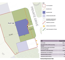 Plot 09 will allow for 4.1m of ornamental shrub planting to be implemented at the front of the house as per the outlined requirements. Awareness is given to the plot owners that all planting, landscaping, and biodiversity measures undertaken during construction may be at risk of damage and must be replaced. It is advised to allow for regular irrigation and inspection of any planting throughout construction works. Any landscaping should be in accordance with the specification set out in the Design Code including species and planting requirements.
