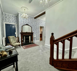 ENTRANCE HALLWAY - This magnificent entrance hallway is fitted with three ceiling roses with ceiling lights, a large impressive, carpeted staircase leads up to the first floor with stunning wooden balustrade, ornate fireplace with a wooden surround inset with an electric fire sitting on a slate hearth, windows overlooking the side aspect, electric wall mounted heater and doorways leading through into various different reception rooms.
