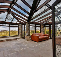 To the front, a beautifully appointed study exudes character with its ornate fireplace and log-burning stove—an ideal space for quiet contemplation or working from home. A nearby cloakroom with decorative features and bespoke storage continues the attention to detail seen throughout. The snug lounge, warm and intimate with its beamed ceiling and multi-fuel burner set into a carved stone surround, opens through double doors to a spectacular conservatory. This glass-fronted space, with its stone-flagged floor and full-height windows, frames stunning countryside views and offers a peaceful retreat to enjoy the changing seasons.