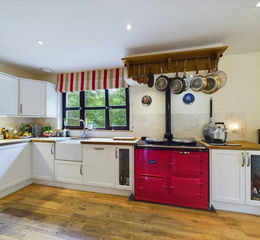Modern fully fitted kitchen, Aga, pendant lighting, spot lighting, integrated dishwasher fridge and freezer.