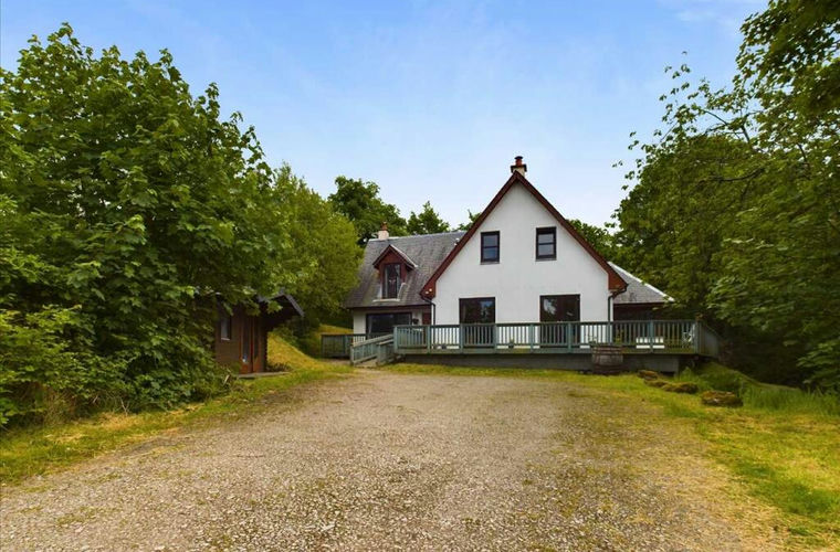 Tighnadrochit, Tayinloan by Tarbert is a stunning family home set in a rural location with amazing sea views across to Gigha and Jura from the first floor and garden. This modern one and a half storey chalet style property was built around 15 years ago. It has a slate roof with white rendered walls nestled in woodland. The house has five bedrooms, the master bedroom has an en- suite. On the ground floor there is a kitchen/Diner, sun room, sitting room, study or bedroom 5, cloakroom, utility room. On the first floor is a master bedroom three further bedrooms and a shower room. There is a Summerhouse in the garden, the garden and grounds are set on around 2 acres creating a very private position. All the main rooms take advantage of the views, the wrap around decking is a perfect vantage point to watch the visiting birds and deer. In the evening the lights under the decking floodlight the stream and bridge. Occasionally an otter may be seen in the nearby burn called Leith Ullit. Golden sandy beaches are just a two minute drive away.